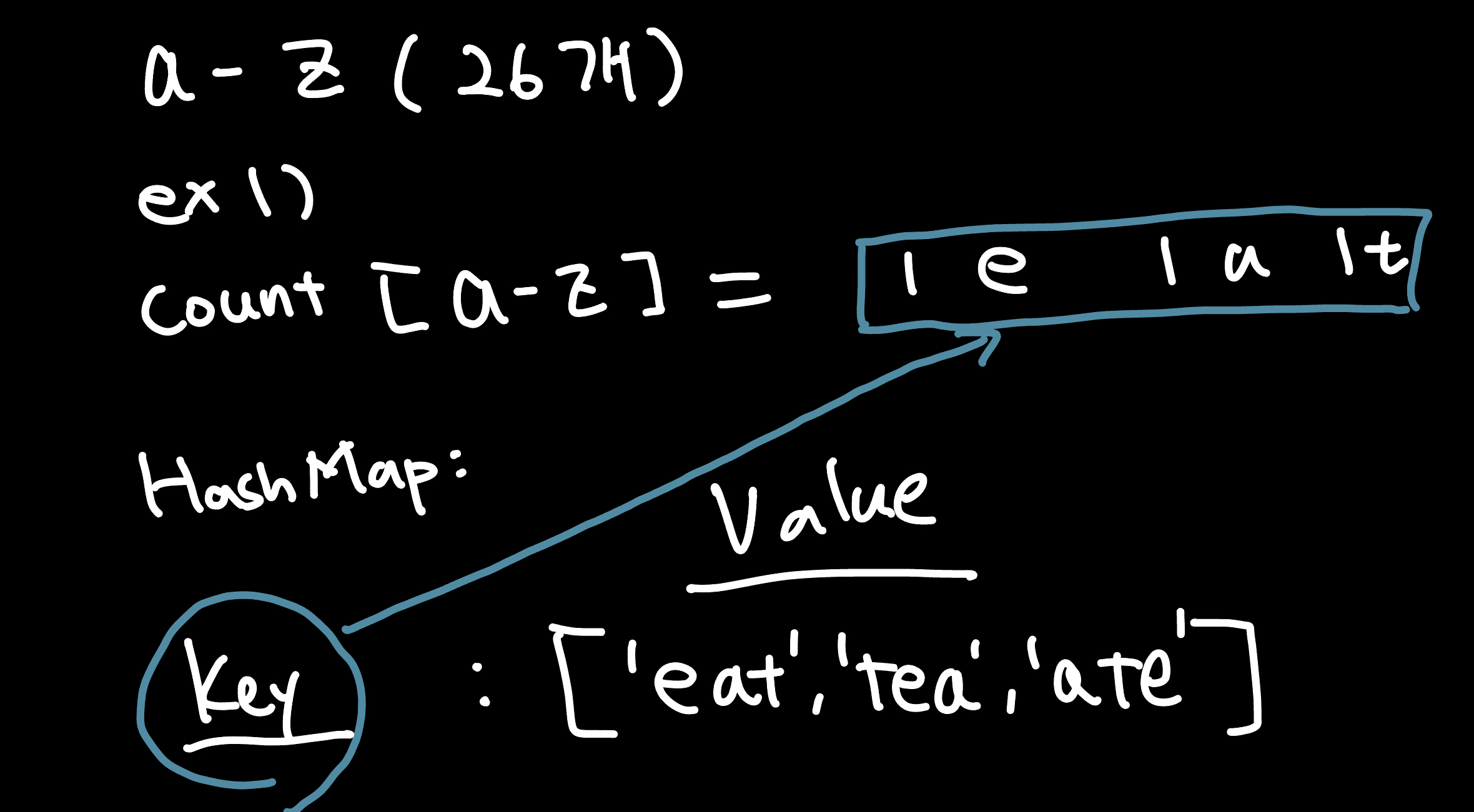 {(1, 0, 0, ..., 0): ['bat'], (1, 1, 1, ..., 0): ['eat', 'tea', 'ate'], (1, 0, 1, ..., 1): ['tan', 'nat']}